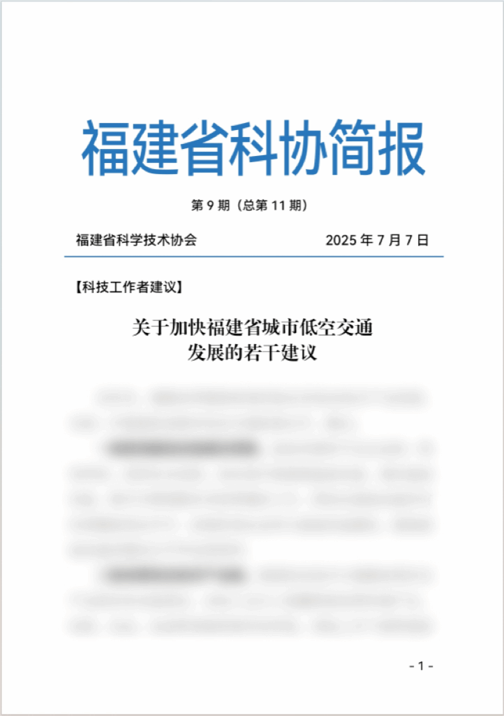 近日,福建省系统工程学会编撰的《福建省城市空中交通(UAM)发展现状与对策政策专报》被福建省科学技术协会采纳,刊发于《福建省科协简报》2025年第9期。本政策专报也是福建省科协十届委员专项资助课题的成果之一,有效支持我省低空经济相关决策。