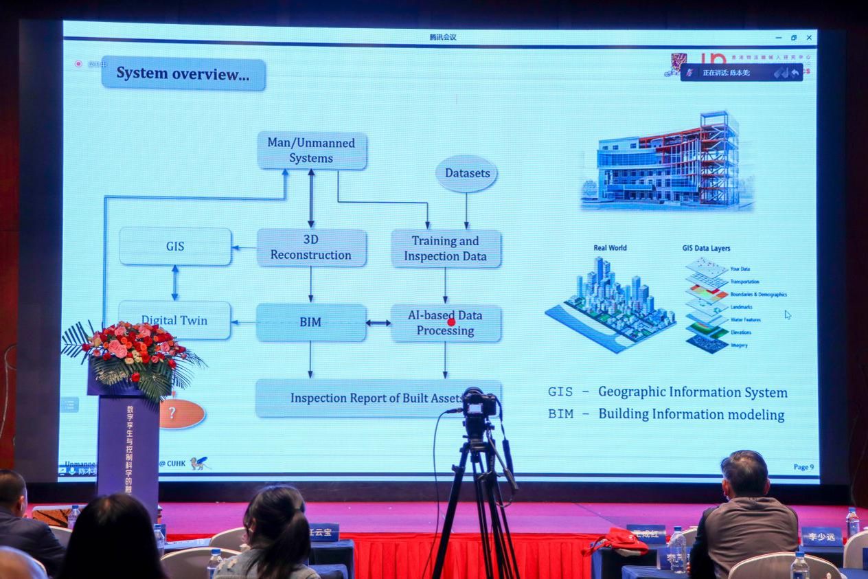 最后,新加坡工程院院士、香港中文大学陈本美教授作题为《AI and UAS Technologies for Infrastructure Inspection and Management》的主旨报告。报告中陈院士展示了一个具有先进AI和无人机系统(UAS)技术且完全自主、功能齐全的基础设施检查和信息管理系统。该系统包括用于自动飞行控制、任务和运动计划的复杂无人机硬件平台和软件系统,可用于图形和红外数据处理的人工智能算法和软件平台,以及与数字孪生和地理信息系统(GIS)集成的建筑信息建模(BIM)和管理系统。与人工检查相比,具有更经济、更安全、更灵活和更高效的优点,也可用于其他工业应用领域。