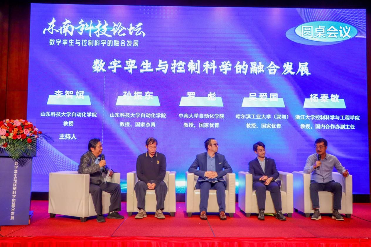 主旨报告环节结束后,论坛进入主题为“数字孪生与控制科学的融合发展”的圆桌研讨。山东科技大学自动化学院李智斌教授应邀主持,与国家杰青、山东科技大学孙振东教授,国家优青、中南大学自动化学院罗彪教授,国家优青、哈尔滨工业大学深圳研究院吴爱国教授,浙江大学控制科学与工程学院、国内合作办副主任杨秦敏教授等四位嘉宾围绕主题,结合自己的研究领域、经历和成果畅所欲言,分别从不同角度,就数字孪生的发展趋势、应用现状和应用前景,对控制学科的专业建设与发展前景展开了精彩分享和热烈研讨,在思想火花的碰撞中也提出了宝贵意见和建议。
